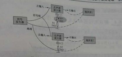 立體聲平衡調(diào)整方法:給左右聲道輸入適當(dāng)?shù)南嗤笮〉臏y(cè)試信號(hào)(一般特定頻率的正弦信號(hào),有信號(hào)發(fā)生器提供),如圖2所示,在左、右聲道輸出端分別街上毫伏表,調(diào)整平衡貼片可調(diào)電阻RP1,使兩個(gè)聲道輸出信號(hào)幅度大小相等。
